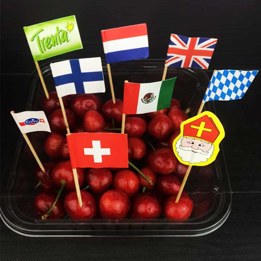 Each flag is made from high-quality paper mounted on a sturdy wooden toothpick. Eco-friendly options are available using biodegradable materials.